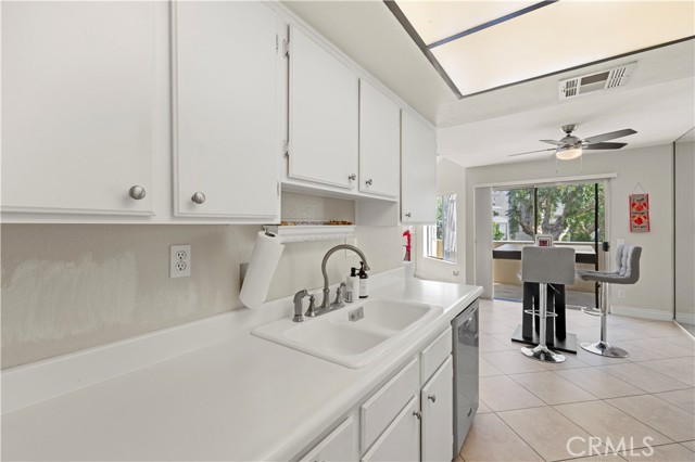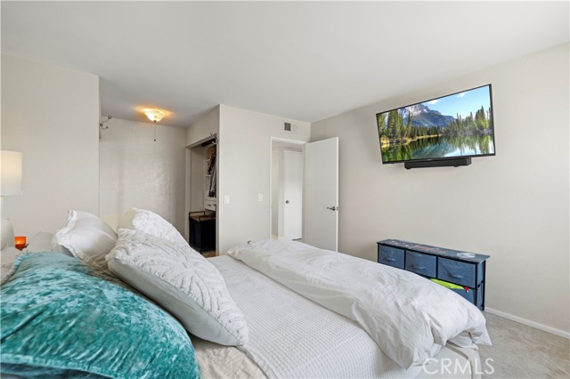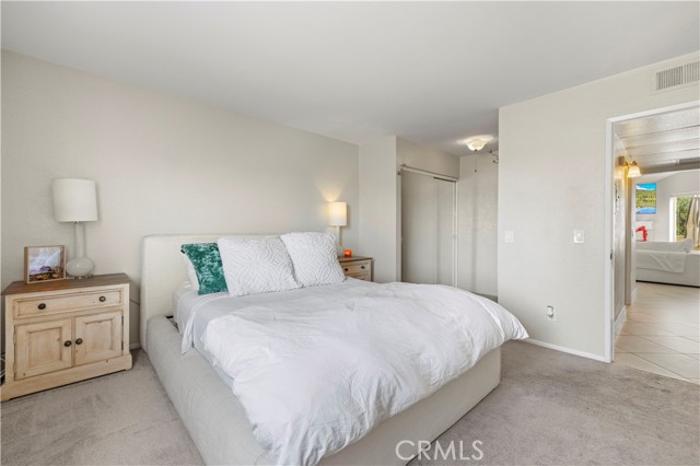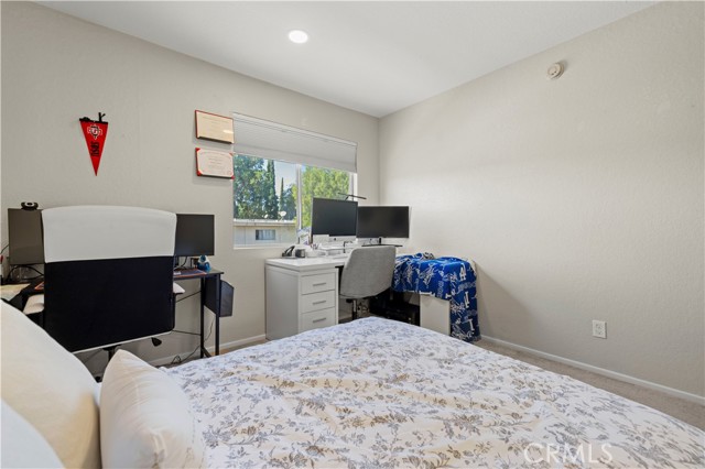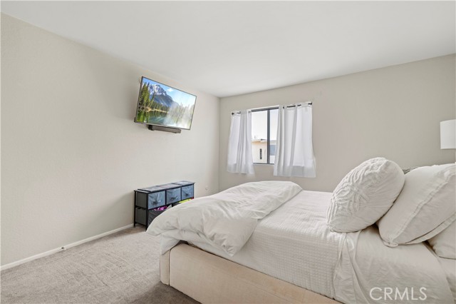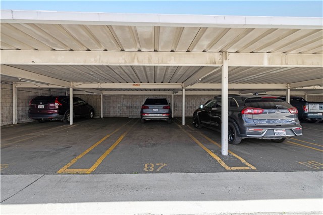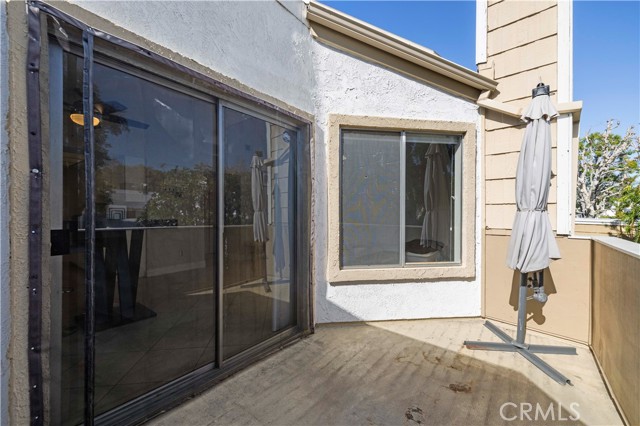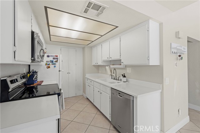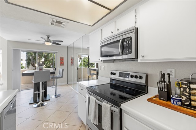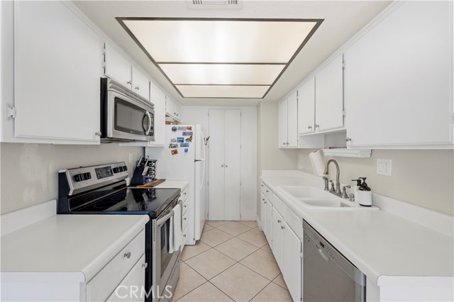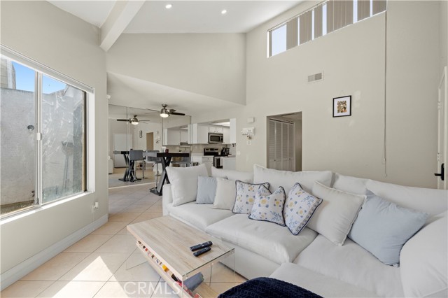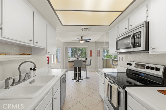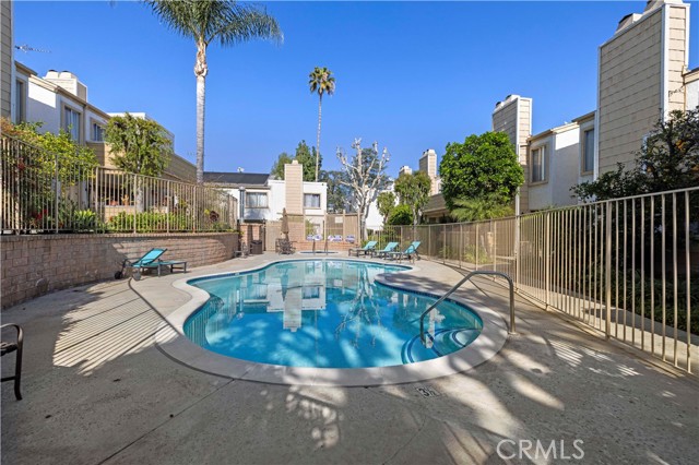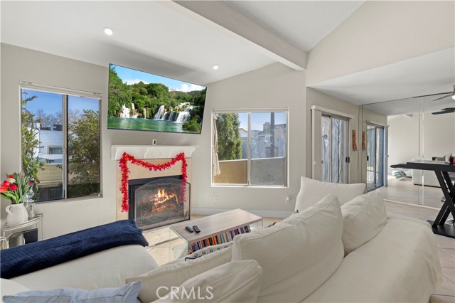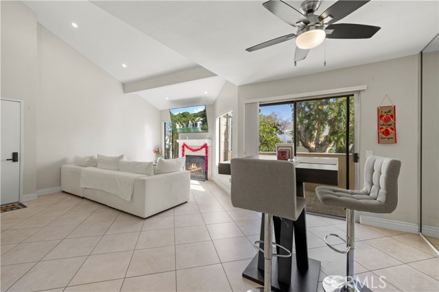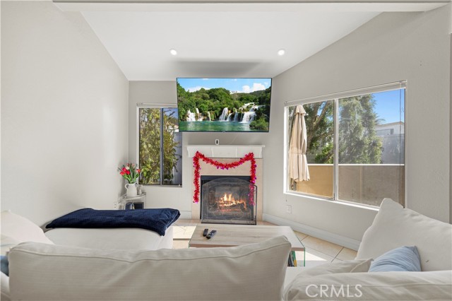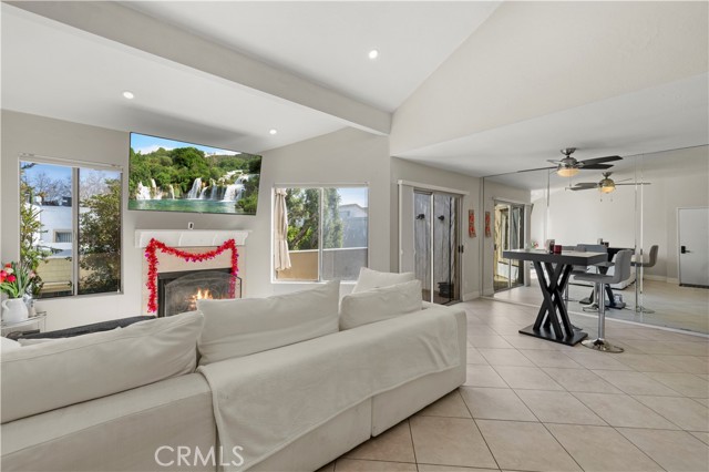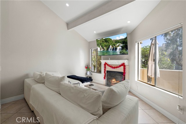 This beautiful upper-level condo is located in one of Tarzana's most sought-after gated communities, Tarzana Woods, surrounded by lush landscaping, colorful flower beds, and mature shade trees that create exceptional curb appeal. Step inside to a bright and open floor plan offering approximately 866 square feet of comfortable living space. The spacious living room is filled with natural light and features soaring beamed ceilings, recessed lighting, elegant tiled electric fireplace with mantel, and 18"X18" diagonally laid porcelain tile flooring throughout the main living areas. The open kitchen is light and welcoming, showcasing white cabinetry that extends to the ceiling, laminate countertops, a dual-basin sink, stainless steel appliances — including an electric range, built-in microwave, and dishwasher — a convenient pantry, and easy-care tile floors. Adjacent to the kitchen, the dining area features a lighted ceiling fan, mirrored walls, and direct access to the private balcony, making it ideal for both everyday meals and entertaining. This home offers two generously sized bedrooms and one well-appointed bathroom. The primary bedroom includes a large picture window with honeycomb shades, dual closets — with mirrored wardrobe doors — and plush wall-to-wall carpeting. The second bedroom also features a large window, honeycomb shades, ample closet space with mirrored doors, and wall-to-wall carpeting. The bathroom is tastefully designed with a white vanity, integrated basin, large dressing mirror, designer lighting, tub/shower combination, and porcelain tile flooring. The hallway provides additional storage with a coat closet and abundant linen cabinets. A convenient indoor laundry area with extra storage adds to the home's functionality. Enjoy quiet mornings or evening dining on your private balcony, perfect for relaxing outdoors. Additional highlights include a NEWER HVAC system, a sparkling community pool and spa, and a gated two-car tandem covered carport with built-in storage, plus ample guest parking. Ideally located near shopping, dining, excellent schools, the 101 Freeway, and public transportation, this home offers comfort, convenience, and resort-style living in a prime Tarzana location.
