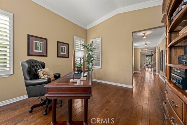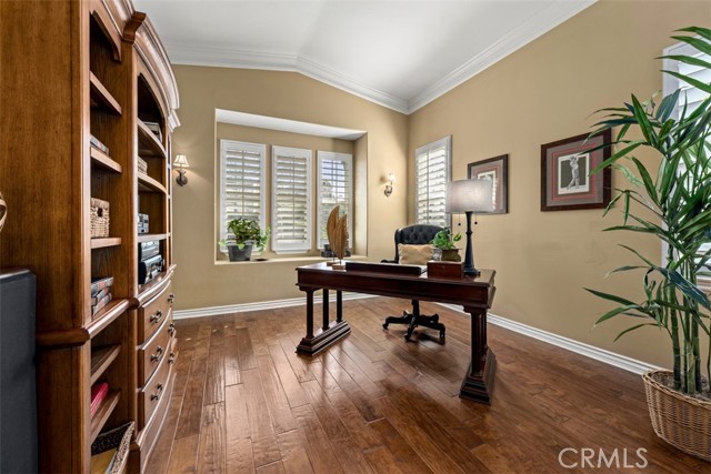 Designed and decorated to impress, this exceptional residence makes an immediate statement from the moment you arrive. A dramatic stacked-stone and wrought-iron entry gate enhances the home's commanding curb appeal, while interlaced flagstone walkways gracefully frame the facade and set the tone for refined living. A private side courtyard leads to the main entry, where a welcoming hallway unfolds with elegant wood flooring that flows throughout the home. The entry hall splits effortlessly, guiding you to a living room currently styled as a sophisticated executive office, ideal for both productivity and presentation. At the end of the hall, a formal dining room commands attention with custom wine-red walls and an ornate light fixture, creating a striking setting for formal gatherings and memorable dinner events. The open-concept kitchen, anchored by a substantial granite-clad island, seamlessly connects to the family room, offering both function and style. French doors open to a serene backyard retreat that's simple and low maintenance. The unobstructed mountain views, walking trails, and twinkling city lights provide a breathtaking and tranquil backdrop. The second level reveals a spacious den and a charming hallway ledge that adds architectural interest and visual warmth. Wood shutters line most windows, while custom blinds and drapery introduce accent and flair throughout. Secondary bedrooms, surprisingly spacious are finished with custom textured carpeting, offering comfort and sophistication. The primary suite is a restorative sanctuary fitted with spa-inspired primary bath featuring elegant granite counters, full tiled-wall showers, detailed backsplashes, and a luxurious soaking tub wrapped in a granite slab, promising a quiet and indulgent retreat. Crown molding throughout elevates the home's executive aesthetic, complemented by curated light fixtures, ceiling fans, toile and sheer curtains that harmonize each space with thoughtful cohesion. Not to miss is a main floor bedroom that hold it's own elegant setting, finished with custom designer textured carpeting and enhanced with rich color bedding and drapery. A full bathroom on the main level provides convenience, offering an ideal accommodation for guests, multi-generational or extended living needs. All of this is set against spectacular, sweeping views within the exclusive guard-gated community of Hawks Pointe, where privacy, prestige, and refined living converge. Whole house feature PEX piping.