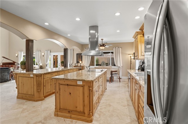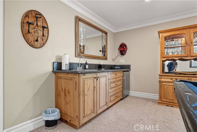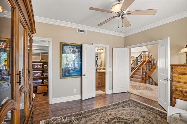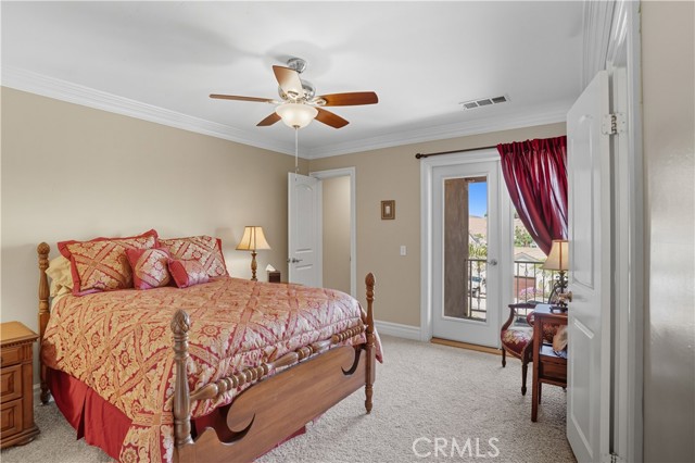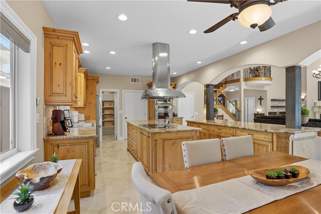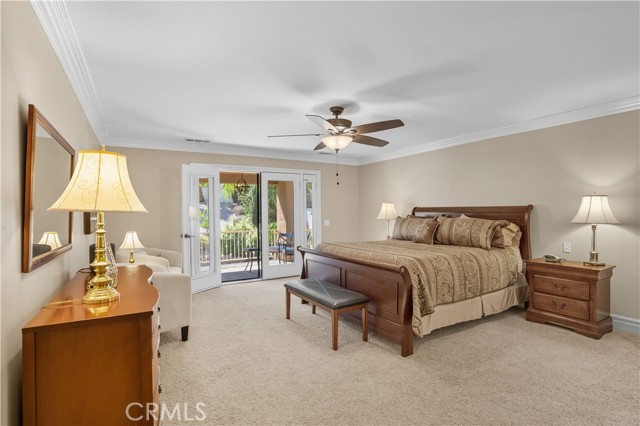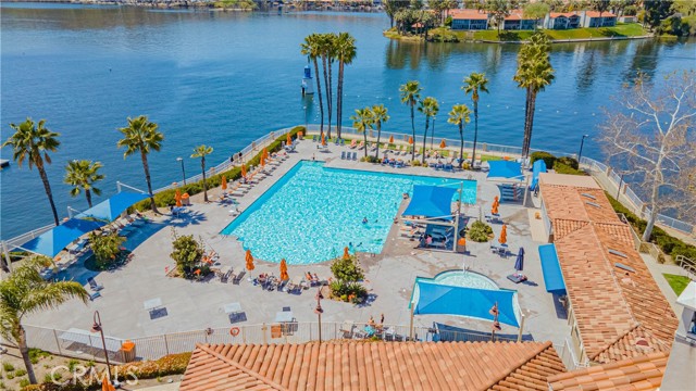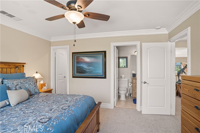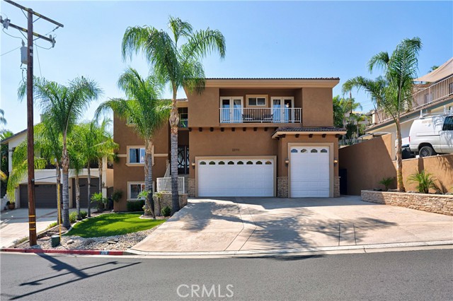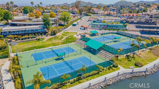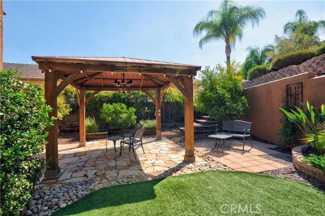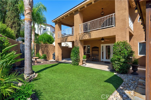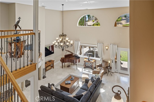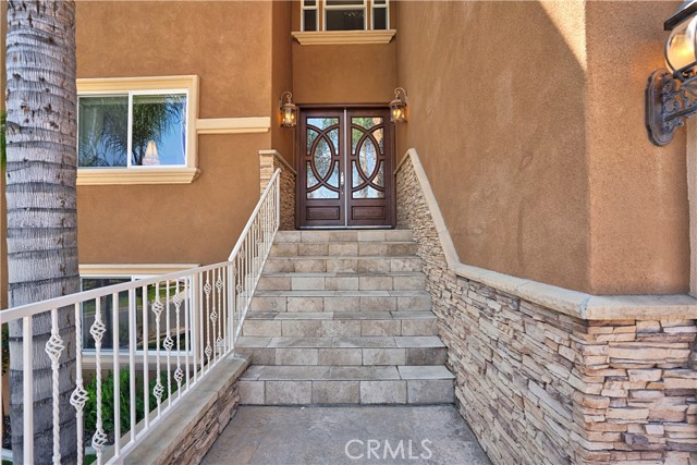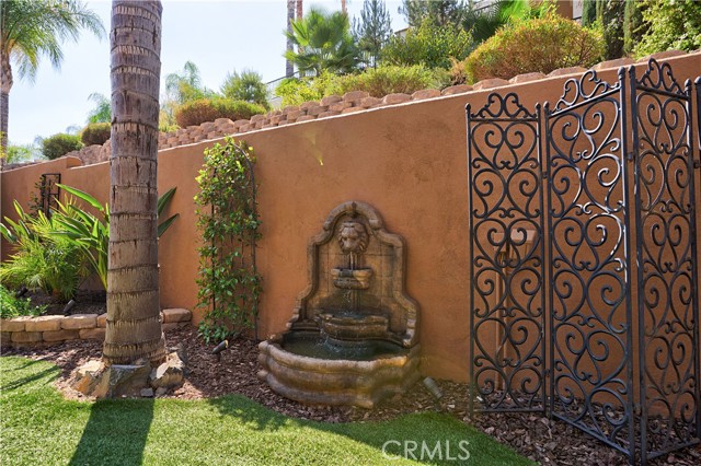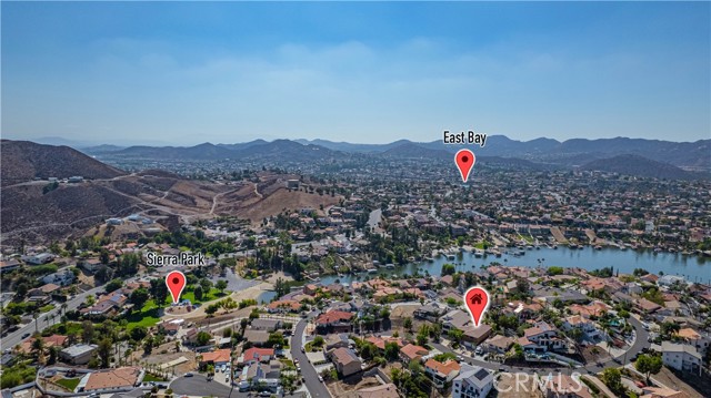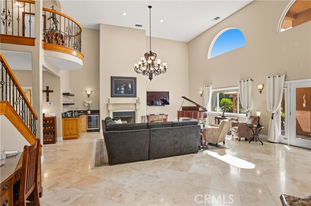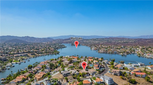 Tri-level custom Mediterranean home located in the coveted Canyon Lake community. This stunning 3,505 sq ft residence offers 5 bedrooms ALL featuring private bathrooms and walk-in closets with organizers, situated on an 8,276 sq ft lot designed for elegance and entertaining. Exceptional curb appeal welcomes you with classic Mediterranean architecture, lush palms on auto-drip, astroturf with decorative rock, and a 3-car epoxy-finished garage with RV/golf cart space. A limestone-trimmed travertine staircase leads to custom beveled glass double doors. Inside, soaring 19-foot ceilings and a diamond-pattern travertine foyer open to a grand great room featuring an open-concept living and kitchen space with dual granite islands — ideal for entertaining. The great room includes a wood-burning fireplace, wet bar with wine refrigerator, and custom shelving. The chef's kitchen side of the great room is equipped with 2 oversized granite kitchen islands with custom built-ins, stainless steel appliances including dual Thermador ovens, microwave, dishwasher, refrigerator, Viking 5-burner range with hood, dual sink, walk-in pantry, side garage access door to bring in groceries from the garage, and backyard views. Step outside to a private retreat with covered patio, gazebo, new fountain, shed, and terraced garden spaces framed by astroturf and retaining walls with side-yard ladder access to multiple fruit trees. The main-level primary suite tucked away next to the front door, offers peaceful community views, a walk-in closet, and a bath with travertine finishes, soaking tub, and glass-enclosed walk-in shower. The luxurious laundry room features granite counters, farm sink, and ample cabinetry. The lower third level /sixth carpeted bedroom, currently used as a game room with pool table, second granite wet bar, sink, refrigerator, walk-in closet, and window. Upstairs, a Romeo and Juliet balcony overlooks the great room. Four additional bedrooms include two sharing a Jack-and-Jill bath with balcony patios with peek a boo lake views. 2 upstairs primary ensuite retreats- 1 features its own balcony, spa-inspired bath with jetted tub, walk-in shower, dual vanities, and custom closet organizer. Located within Canyon Lake's 24-hour guard-gated community offering resort-style amenities including a private 525-acre lake, 18-hole SCGA-rated golf course & restaurant, lakefront pool & clubhouse, RV park, equestrian center, tennis, pickleball, beaches, parks, boat docks...
