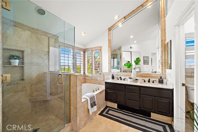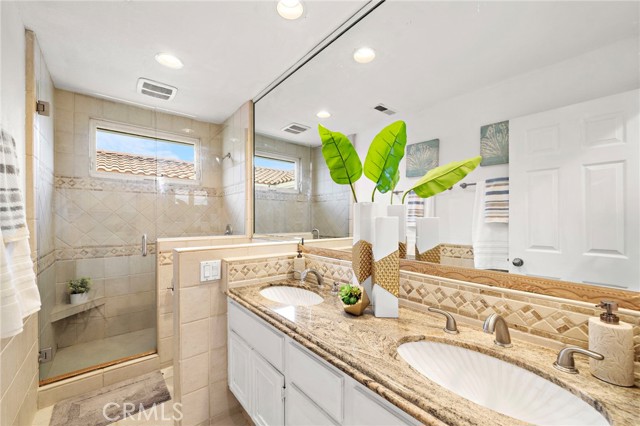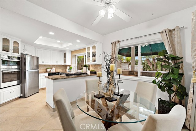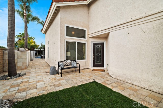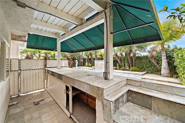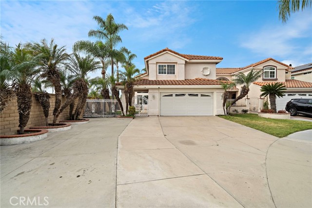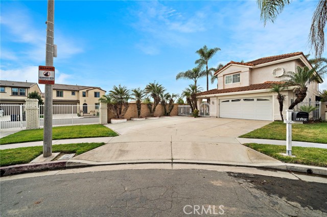 Nestled at the end of a quiet cul-de-sac within an exclusive enclave of just 30 executive homes built in 1988, 4-car driveway provides generous parking and convenience, while the backyard is a true retreat featuring a luxury waterfall pool. Home is ideally located in a top school zone and sits on the largest lot in the neighborhood with 6,459 square feet. Boasting 5 bedrooms and 3 bathrooms, including a downstairs bedroom (currently used as an office) and full bath, this home offers a highly desirable and functional floorplan with soaring two-story ceilings, enormous windows for abundant natural light, brand new carpet, and new central A/C. Beautifully appointed throughout, it features travertine-style tile flooring across the lower level, dual pane windows, plantation shutters, recessed lighting, arched passages, decor niches, custom mirrored walls, raised panel interior doors, mirrored closets, and ceiling fans. Entry begins through a large gated courtyard with tranquil waterfall, lawn, and paver walkway leading to a stunning front door adorned with full beveled leaded glass. Inside, a grand foyer welcomes you to elegant formal living and dining rooms and an upgraded kitchen showcasing granite countertops, travertine backsplash with granite inlay, brand new stainless appliances and a sunny eat-in morning room that opens to the inviting family room with gas fireplace. A dramatic hand-crafted hardwood staircase leads upstairs to a luxurious primary suite retreat featuring a two-sided fireplace, sitting area, walk-in closet, private balcony overlooking the tropical backyard, and a spa-style bath with oval soaking tub, separate shower, and dual sinks. Three additional spacious bedrooms and a hall bath with dual sinks and travertine tub/shower complete the upper level. The backyard is a true private resort with sparkling pool, spa, multiple waterfall features, custom travertine-style paver decking and pool surround, lush tropical landscaping, and mature palm trees swaying in the ocean breeze. Entertain in style at the custom built-in BBQ center with long sit-up bar seating (structure in place, no appliances) beneath one of two shade awnings. An inside laundry room offers direct access to the finished garage with epoxy flooring and extensive custom built-in storage.
