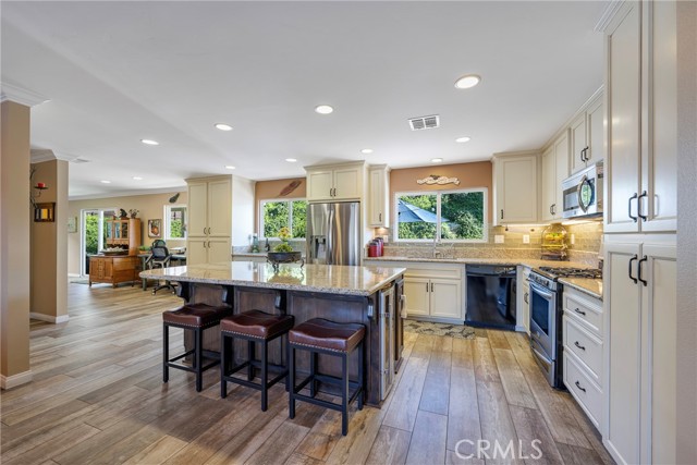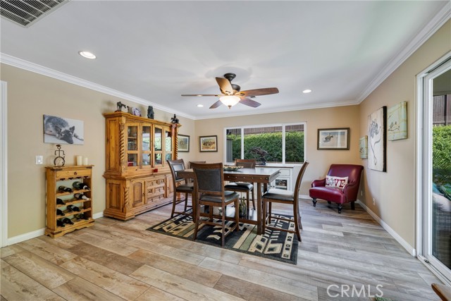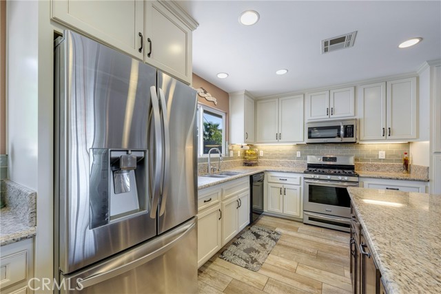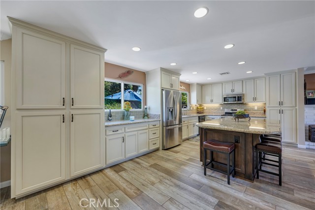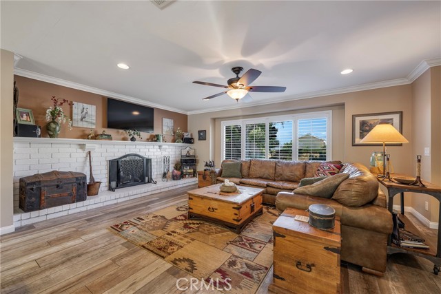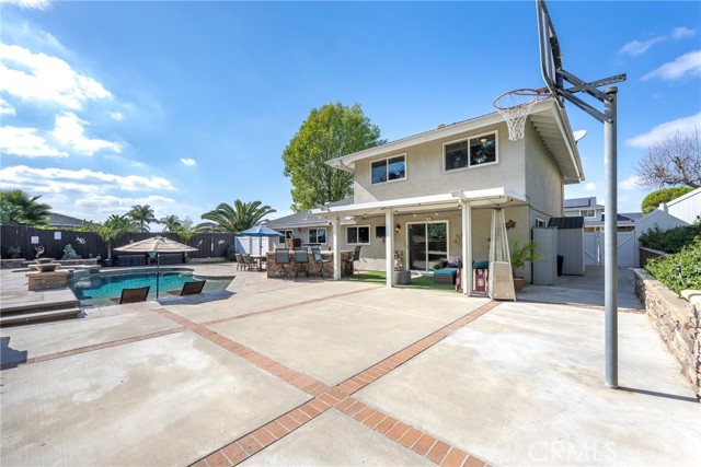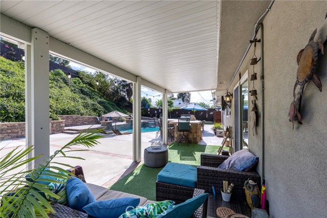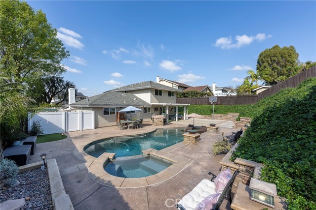 Fully remodeled from top to bottom, this exceptional Fairview Estates home blends thoughtful design, quality finishes, and breathtaking views in one of Yorba Linda's most desirable hillside neighborhoods. The open-concept main level seamlessly connects the living, kitchen & family/dining rooms, all finished with durable luxury plank-tile flooring, creating a bright and inviting space ideal for everyday living and entertaining. The chef's kitchen is a true centerpiece, featuring a large island, dual pantries, granite countertops, tile backsplash, stainless steel appliances, wine refrigerator, and insta-hot faucet. Plantation shutters, crown molding, recessed lighting, and ceiling fans enhance every room with timeless style and comfort. Systems upgrades include central heat and air conditioning, a QuietCool whole-house fan, additional insulation, and an all-house water purification system for improved efficiency and comfort. Upstairs, the enlarged primary suite offers a private retreat complete with a walk-in shower, marble-topped vanity, two closets including a walk-in, and a private balcony showcasing sunset and city light views. A second full bathroom includes a shower over a jetted tub, providing flexibility for family or guests. The resort-style backyard delivers exceptional privacy and amenities, highlighted by a saltwater pool and spa with waterfalls and copper fire pots, controlled by iAqualink. Additional features include an Alumawood patio cover, built-in Jenn-Air barbecue island, and a top-of-the-hill viewing platform offering world-class panoramic views. The front yard is professionally landscaped with drought-tolerant native plants, a dry creek bed, permeable pavers, and smart Rachio irrigation for both front and back yards. Additional highlights include a finished and insulated two-car garage with laundry, custom cabinetry, and workbench, plus storage sheds. Located in unincorporated Yorba Linda within the desirable Fairview Estates neighborhood, this home is near highly sought-after Glenknoll Elementary and top-rated Placentia – Yorba Linda schools. Enjoy convenient access to the 91 and 55 freeways, along with nearby shopping, dining, and entertainment at Yorba Linda Town Center and Savi Ranch, offering the ideal balance of privacy, views, and everyday convenience. 19582 Crestknoll Drive; You Will LOVE Living Here!